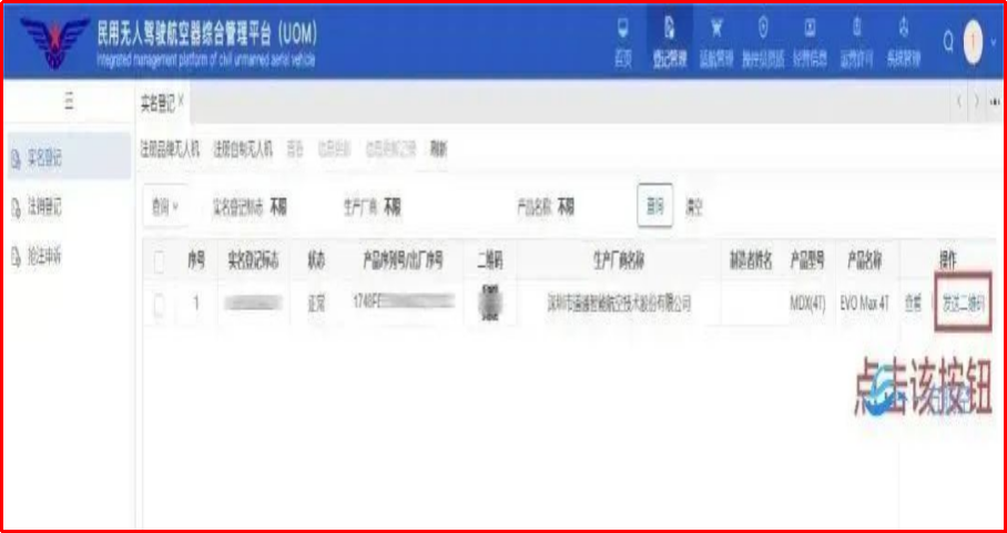 完成注册后,可在实名登记页面中查询到已完成注册登记的无人机,点击右侧[发送二维码]按钮。填写邮箱,下载附件并打印,将二维码粘贴至该无人机的机身上。