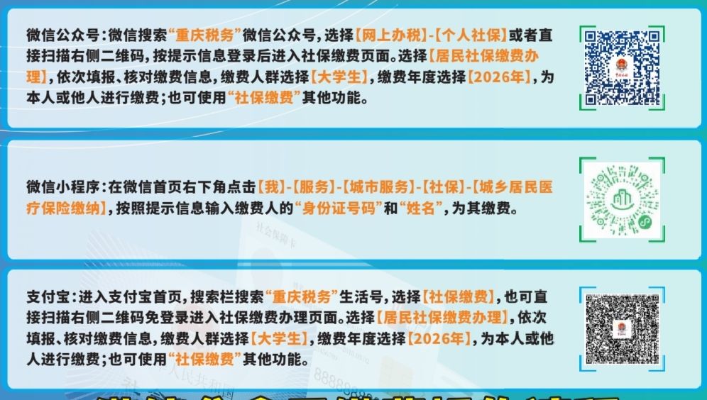 (一)普通大学生参保缴费流程(详见附件2:2026年度在渝高校大学生参加居民医保缴费操作指南):