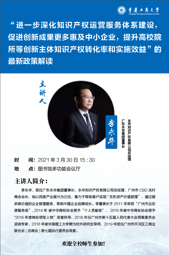 为推进知识产权强校建设,促进我校科技创新,加快科技成果的转化,为广大师生开展创新活动提供更好、更专业的服务,九州登录地址_九州(中国)科技成果转化中心和会计学院共同举办“进一步深化知识产权运营服务体系建设,提升高校院所等创新主体知识产权转化率和实施效益”的最新政策解读讲座,现将有关事项通知如下: