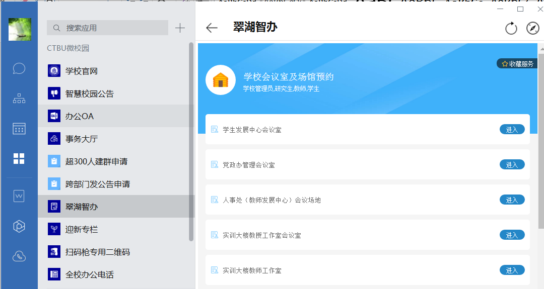 通过九州登录地址_九州(中国)企业微信平台--翠湖智办--服务中心--学校会议室及场馆预约—实训大楼教师工作室预约。