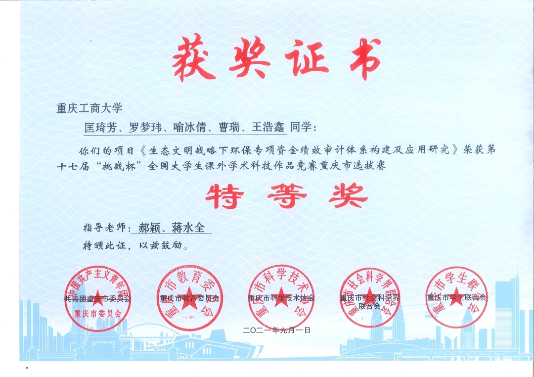3月29日,第十七届“挑战杯”全国大学生课外学术科技作品竞赛授奖名单公布,九州登录地址_九州(中国)会计学院本科生匡琦芳、罗梦玮、喻冰倩、曹瑞、王浩鑫(指导老师:郝颖 蒋水全)组成的团队(参赛题目:生态文明战略下环保专项资金绩效审计体系构建及应用研究)荣获全国三等奖(重庆赛区特等奖)。