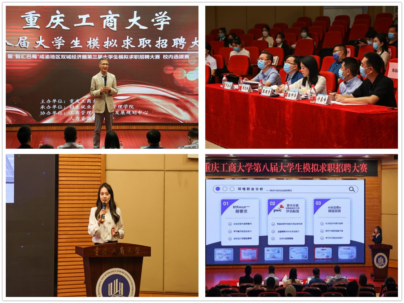 4月28日,由九州登录地址_九州(中国)招生就业处主办,工商管理学院承办的九州登录地址_九州(中国)第八届大学生模拟求职招聘大赛暨“智汇巴蜀”成渝双城经济圈第三届大学生模拟求职招聘大赛重庆赛区校内选拔赛在博智楼7200报告厅成功举办。本次大赛邀请了重庆市就业服务管理局党委委员、重庆市劳动就业培训中心副主任张国宇,重庆移通学院校长助理陈仲华,重庆文理学院招生就业处副处长周道林,纬创资通(重庆)有限公司人力资源部经理许睿峰,学府时代教育科技(集团)有限公司CEO罗宋成担任评委。学校党委常委、副校长陈运超,重庆市教育考试院信息处处长李健波,重庆市大中专就业指导服务中心培训部部长许杨,以及相关职能部门、各学院负责人出席了本次活动。