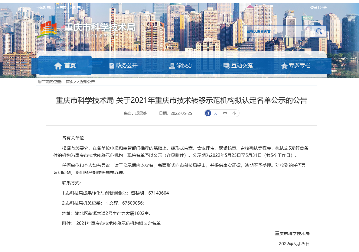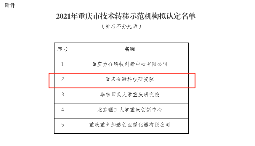 为进一步加强技术转移机构建设,完善技术转移体系和技术交易市场体系,促进重庆市科技成果转移转化,市科技局开展了技术转移示范机构申报工作。经形式审查、答辩评审、现场评估、审核确认等环节,5月25日,重庆市科技局公布了2021年度重庆市技术转移示范机构名单,重庆金融科技研究院成功获评。