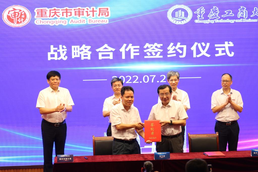 7月26日下午,学校与重庆市审计局战略合作签约仪式在南岸校区博智楼7200报告厅举行。中共重庆市委审计委员会办公室主任、市审计局党组书记、局长姜国杰,副局长戴希、一级巡视员、副局长张海坤,学校党委副书记、校长孙芳城,副校长赵骅,重庆市审计局相关处室负责人、南岸区审计局负责人、首期计算机审计初级培训班学员代表、我校会计学院班子成员及部分教师代表等参加了签约仪式。仪式由会计学院院长罗勇主持。