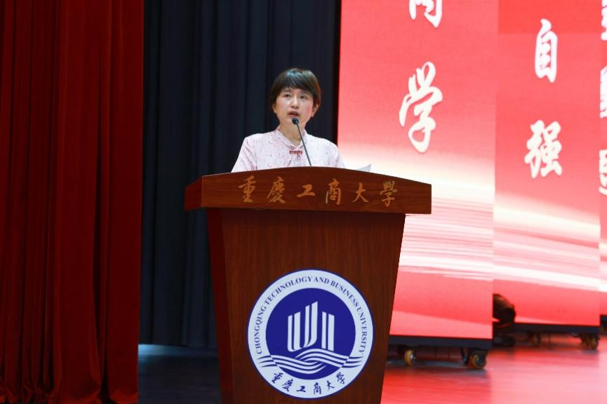 教育部高等学校物流管理与工程教指委委员、重庆市高等学校交通与物流教指委主任、我校管理科学与工程学院的龚英教授代表教师发言。她首先代表全校2500余名教职工对全体新生的到来表示热烈欢迎。她用“有朋自远方来,不亦乐乎”“黄河之水天上来,奔流到海不复回”“宝剑锋从磨砺出,梅花香自苦寒来”“更无柳絮因风起,惟有葵花向日倾”四句话向全体新生送上最美好的祝福。她希望学子们始终做一朵永远向阳怒放的葵花,追逐光明、百折不挠、不卑不亢、傲然挺立。