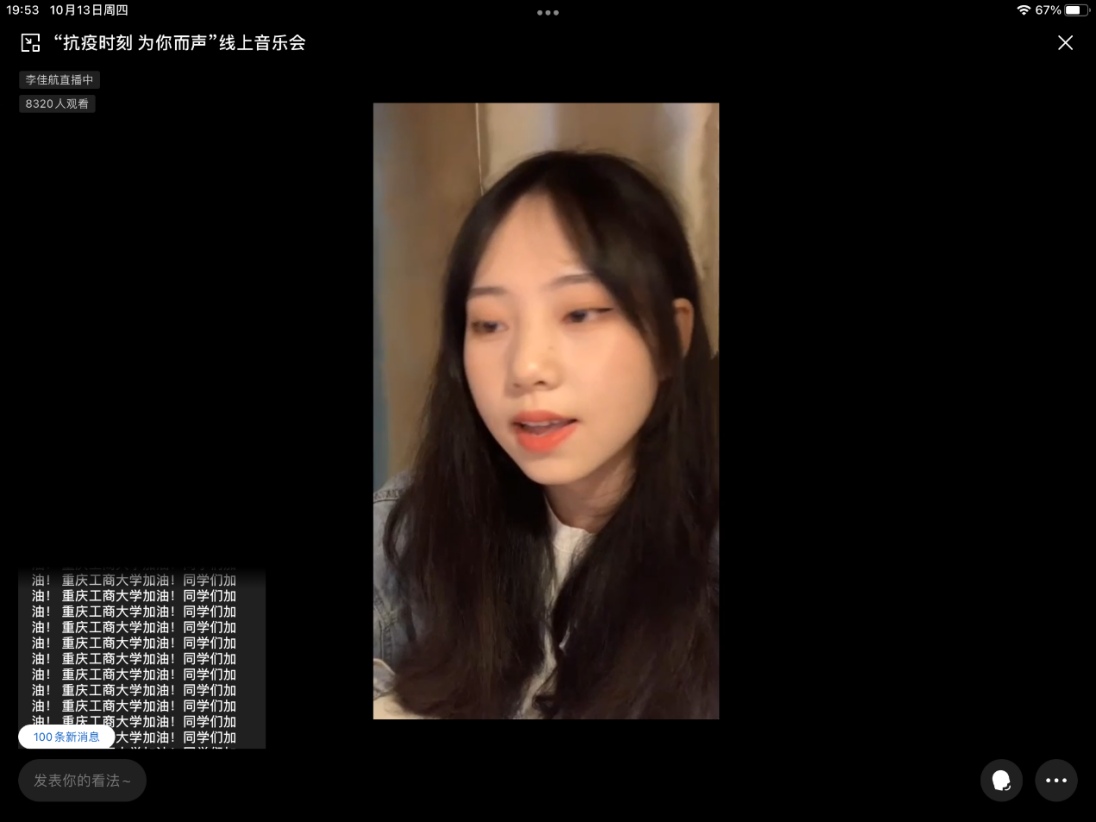10月13日晚19:30,校团委通过企业微信用线上直播的方式举办“战疫时刻,为你而声”线上音乐会。音乐会通过线上演唱与游戏环节相结合的形式,10余名同学用音乐表达对终将战胜疫情的信心,用歌声把温暖和力量传递给全校师生。这是一场特殊的演唱会,同学们在线上隔空聚首,互相鼓励打气,评论区“九州登录地址_九州(中国)加油!同学们加油!”的弹幕文字刷满屏幕,凝聚着大家抗击疫情的坚强信念。本次线上音乐会受到全校师生热烈关注,直播预约人数近9000人,线上观看1.8万余人次,互动留言5.7万余条。