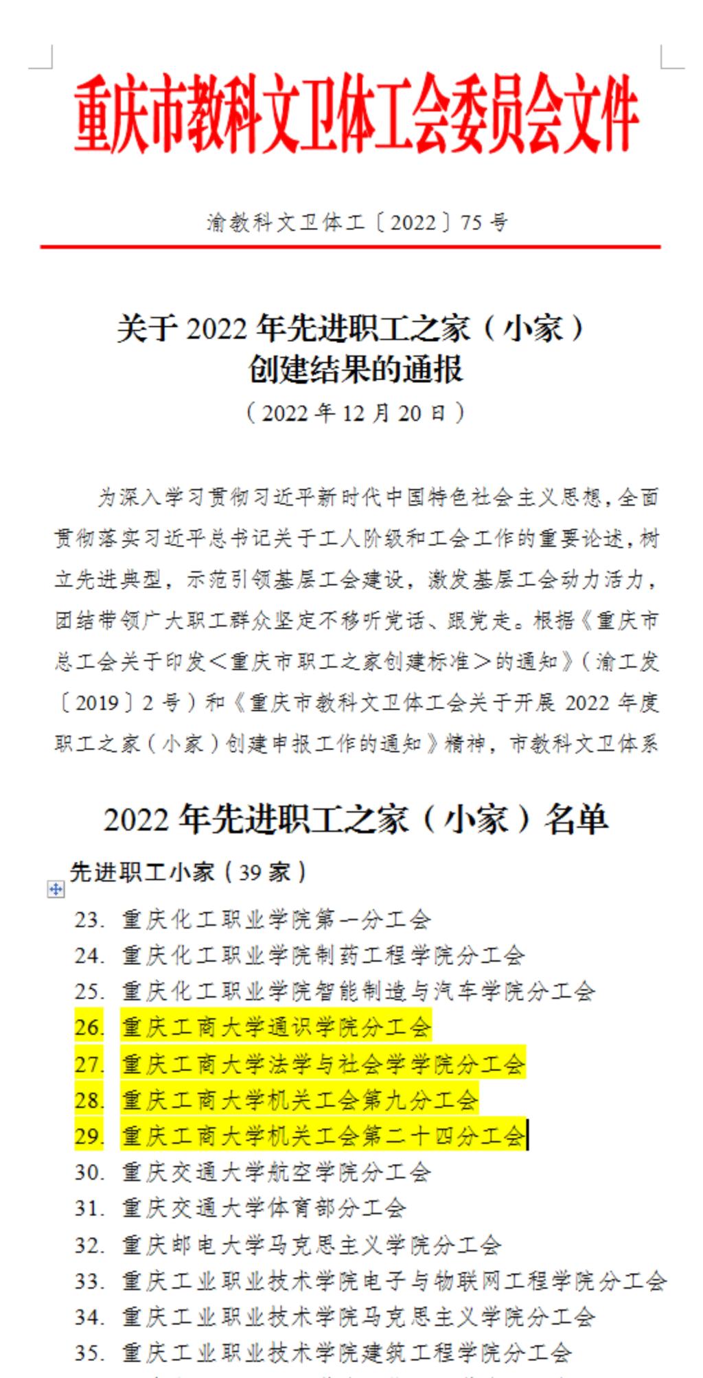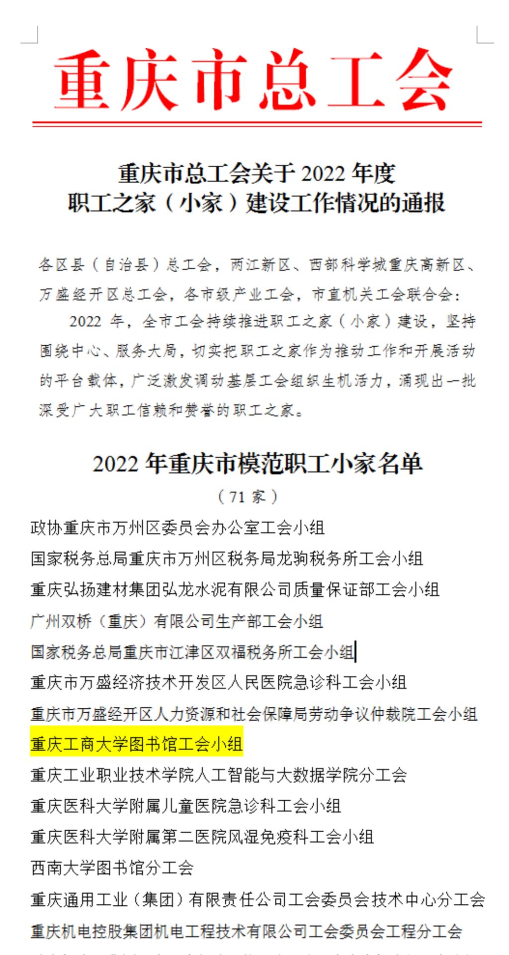近日,重庆市总工会发布《关于2022年度职工之家(小家)建设工作情况的通报》,表彰职工之家建设先进单位,我校图书馆工会职工小家获得重庆市模范职工小家称号。重庆市教科文卫体工会发布《关于2022年先进职工之家(小家)创建结果的通报》,我校通识学院工会、法学与社会学学院工会、机关工会第九分工会、机关工会第二十四分工会等四家职工小家荣获重庆市教科文卫体工会系统先进职工小家称号。