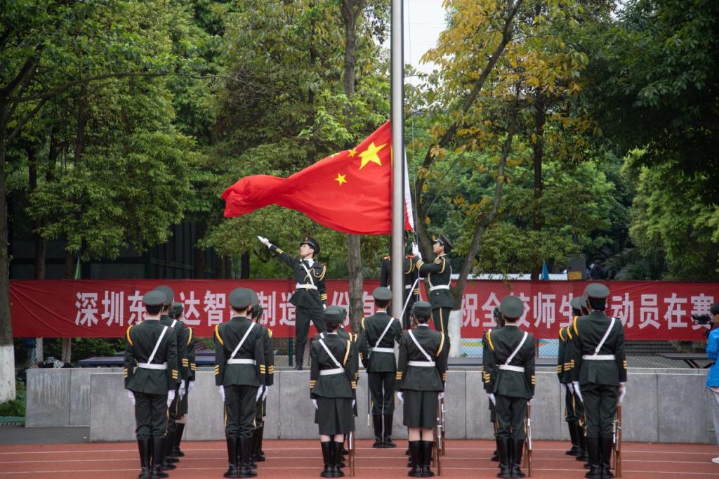 升旗仪式时,国旗护卫队的队员们踏着整齐矫健的步伐,目光坚定,腰背挺拔,以昂扬的姿态将国旗护送至升旗台。《义勇军进行曲》响起,扬旗手振臂一挥,鲜艳的五星红旗冉冉升起,迎风招展,与日同辉。现场观礼师生庄严肃立,向国旗行注目礼。