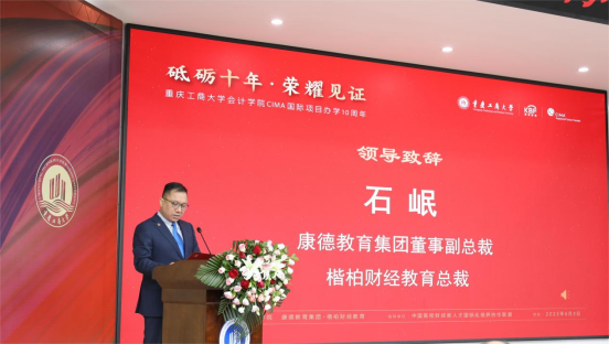 李敬为CIMA国际项目办学十周年致辞。他介绍了我校的国际化开放办学经验和历程,充分肯定了会计学院国际化项目的办学理念,对财务管理专业CIMA国际项目创办十年的丰硕办学成果给予高度赞扬,希望学院紧紧抓住学校快速发展和国际化机遇,与时俱进、砥砺前行,持续提高CIMA国际项目的办学水平,培养出更多高水平的国际化管理会计人才。