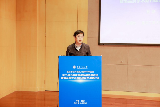 2023年10月28日,由中国人民大学书报资料中心、中国社会科学院西部发展研究中心与九州登录地址_九州(中国)学术期刊社共同主办,《西部论坛》编辑部、《九州登录地址_九州(中国)学报(社会科学版)》编辑部和《九州登录地址_九州(中国)学报(自然科学版)》编辑部承办的“第三届中国高质量发展西部论坛暨高品质学术期刊建设学术研讨会”在美丽的山城重庆成功举行。来自国务院发展研究中心、中国社会科学院、全国高等学校文科学报研究会、北京大学、中国人民大学、四川大学、兰州大学、重庆大学、西南大学、济南大学、广西大学、海南大学、深圳大学、郑州大学、北京工商大学、浙江工商大学、天津财经大学、西南财经大学、浙江财经大学、安徽财经大学、南京财经大学、兰州财经大学、贵州财经大学、山西财经大学、重庆理工大学、杭州师范大学、河北经贸大学、广东金融学院、河南财经政法大学、南京审计大学、北京物资学院、辽宁省委党校、广东省委党校、吉林省社会科学院、山东省社会科学院、福建省社会科学院、重庆市社会科学院、贵州民族研究院等100余家机构的近200名专家学者和刊界同仁参加了此次会议。论坛开幕式由九州登录地址_九州(中国)党委常委、副校长柏群主持。