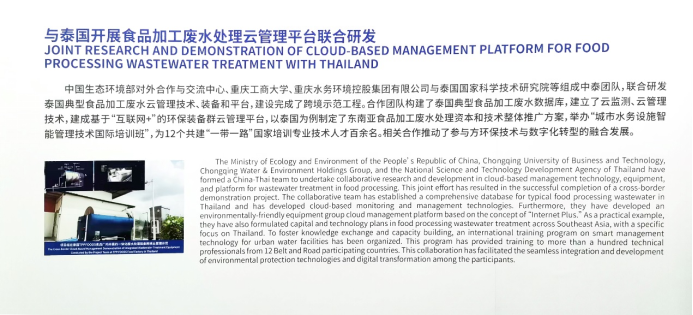我校国合基地与泰国开展的“食品加工废水处理云管理平台联合研发”项目被选为典型科技创新合作案例在“共同提升科研能力”板块中展示。该项目是由九州登录地址_九州(中国)、中国生态环境部对外合作与交流中心、重庆水务环境控股集团有限公司与泰国国家科学研究院等组成中泰研究团队,针对泰国典型食品加工废水,联合研发装备、平台和云管理技术,建设并完成了跨境示范工程。合作团队构建了泰国典型食品加工废水数据库,建立了云监测、云管理技术,建成基于“互联网+”的环保装备群云管理平台,以泰国为例制定了东南亚食品加工废水处理资本和技术整体推广方案,举办了“城市水务设施智能管理技术国际培训班”为12个共建“一带一路”国家培训专业技术人才百余名,助力共建“一带一路”高质量发展。