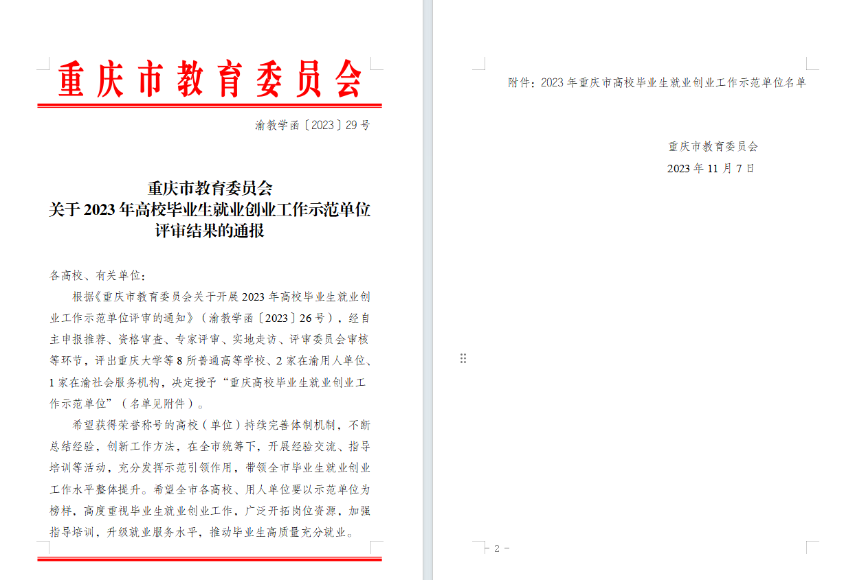 近日,重庆市教育委员会开展了2023年高校毕业生就业创业工作示范单位评选活动。我校获评“2023年重庆市高校毕业生就业创业工作示范单位”。此次评选活动面向重庆市所有高校,评选历经自主申报推荐、资格审查、专家评审、实地走访、评审委员会审核等环节,最终8所高校成功获评。