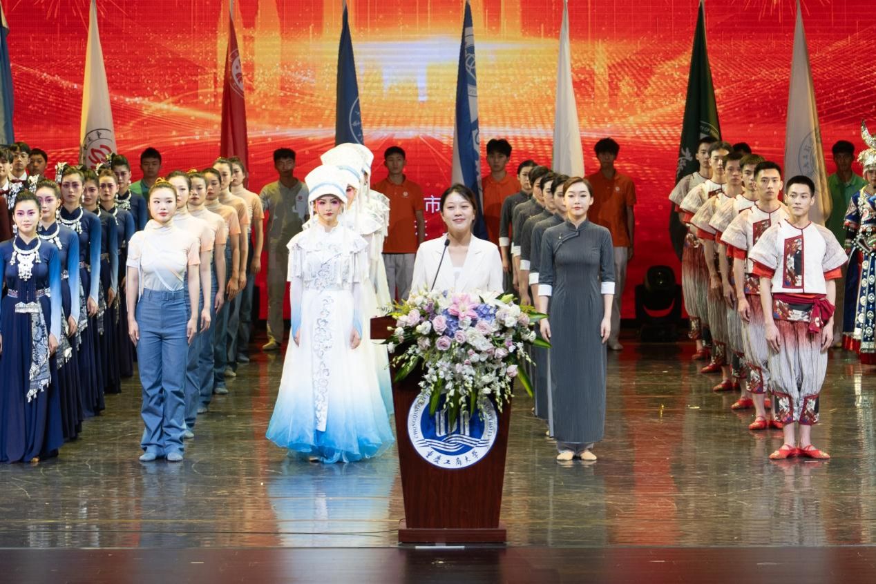 金玲在讲话中向出席开幕式的领导、来宾,老师们、同学们表示热烈的欢迎;向为本次活动给予大力支持的相关高校表示衷心感谢;向入选参加市级现场集中展演的学校和师生们表示热烈祝贺。她谈到,党的二十大报告指出,培养造就大批德才兼备的高素质人才,是国家和民族长远发展大计。习近平总书记强调,“做好美育工作,要坚持立德树人,扎根时代生活,遵循美育特点,弘扬中华美育精神,让祖国青年一代身心都健康成长。”近年来在市委市政府的坚强领导下,市教委全面贯彻中共中央办公厅、国务院办公厅《关于全面加强和改进新时代学校美育工作的意见》,自觉落实立德树人的根本任务,深化五育并举,培根铸魂,坚持把学校美育作为落实立德树人根本任务的重要途径,作为传承创新中华优秀传统文化的重要载体,着力抓改革、优评价、研课程、深融合、搭平台、强引领,涌现出一大批具有时代特征、学校特色、学生特点、教育特质和重庆辨识度、全国影响力的学校美育实践品牌,唱响了立德树人主旋律,奏响了协同育人的交响乐。她谈到,本届参演作品呈现出主题鲜明、形式多样、内容丰富的特点,既充分展现了我市高校美育工作取得的丰硕成果,更充分彰显了我市当代大学生生机蓬勃,积极向上的良好精神风貌。她希望参赛选手们在比赛中用青春和活力演绎属于自己的才艺和风采,共同把本届活动办成秩序井然、精彩热烈、充满朝气的艺术盛会。她期望全市各高校、各区县更加重视美育工作,始终坚持正确方向,坚持改革创新,不断完善美育体系,提高学生的人文素养,培养德智体美劳全面发展的高素质人才,为新时代、新征程、新重庆建设提供强大的人才支撑和智力支持。随后,金玲宣布重庆市第七届大学生艺术展演活动开幕。