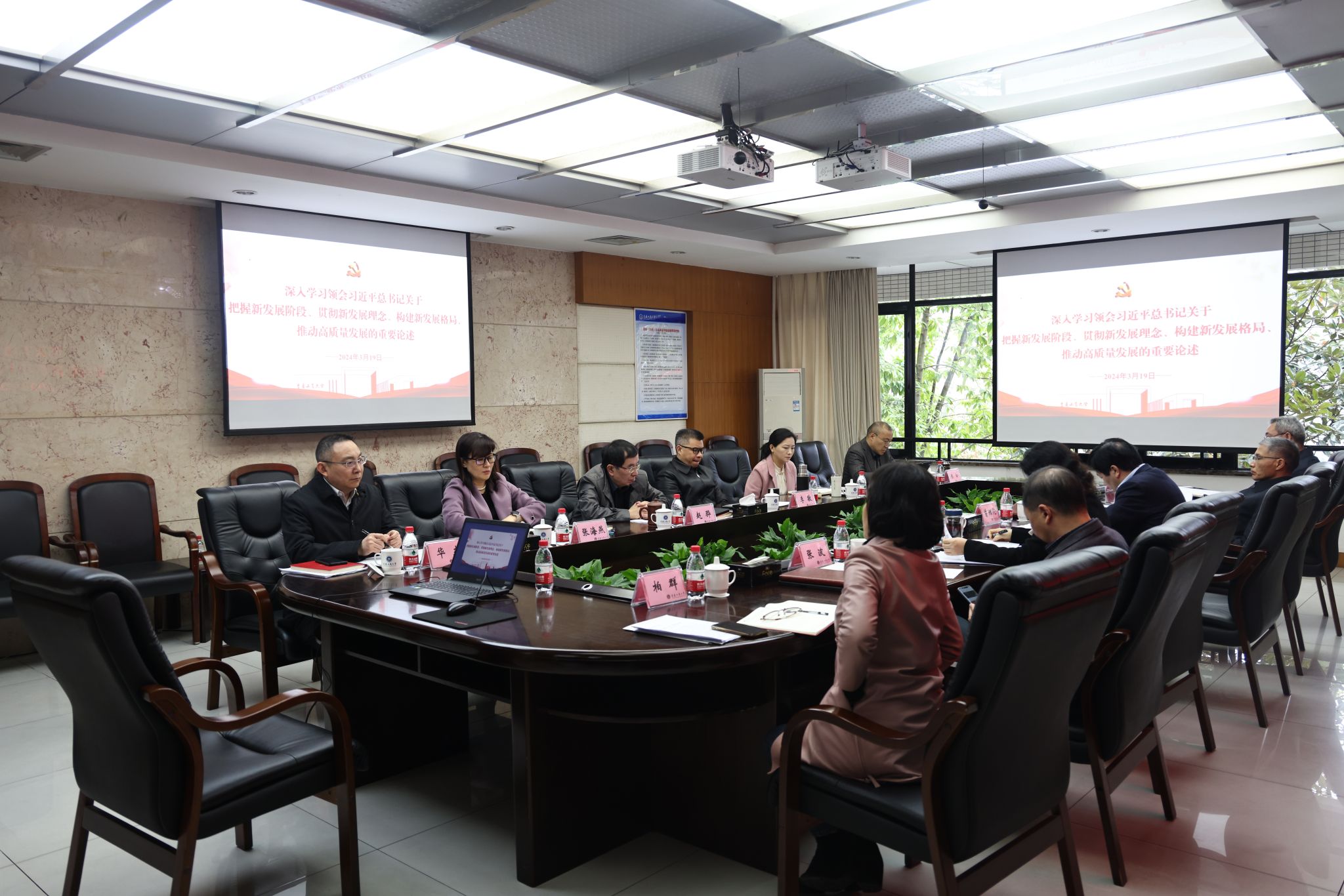 3月19日上午,我校党委理论学习中心组举行专题学习会,深入学习领会习近平总书记关于把握新发展阶段、贯彻新发展理念、构建新发展格局、推动高质量发展的重要论述,学习贯彻习近平总书记在2024年全国两会期间重要讲话精神,深刻领会习近平总书记关于因地制宜加快发展新质生产力论述的精髓要义,进一步增强坚决拥护“两个确立”、坚决做到“两个维护”的思想自觉、政治自觉、行动自觉,积极投身科教兴国战略,主动服务国家重大战略部署和重庆科技创新和人才强市战略,为贯彻新发展理念,发展新质生产力贡献智慧和力量。