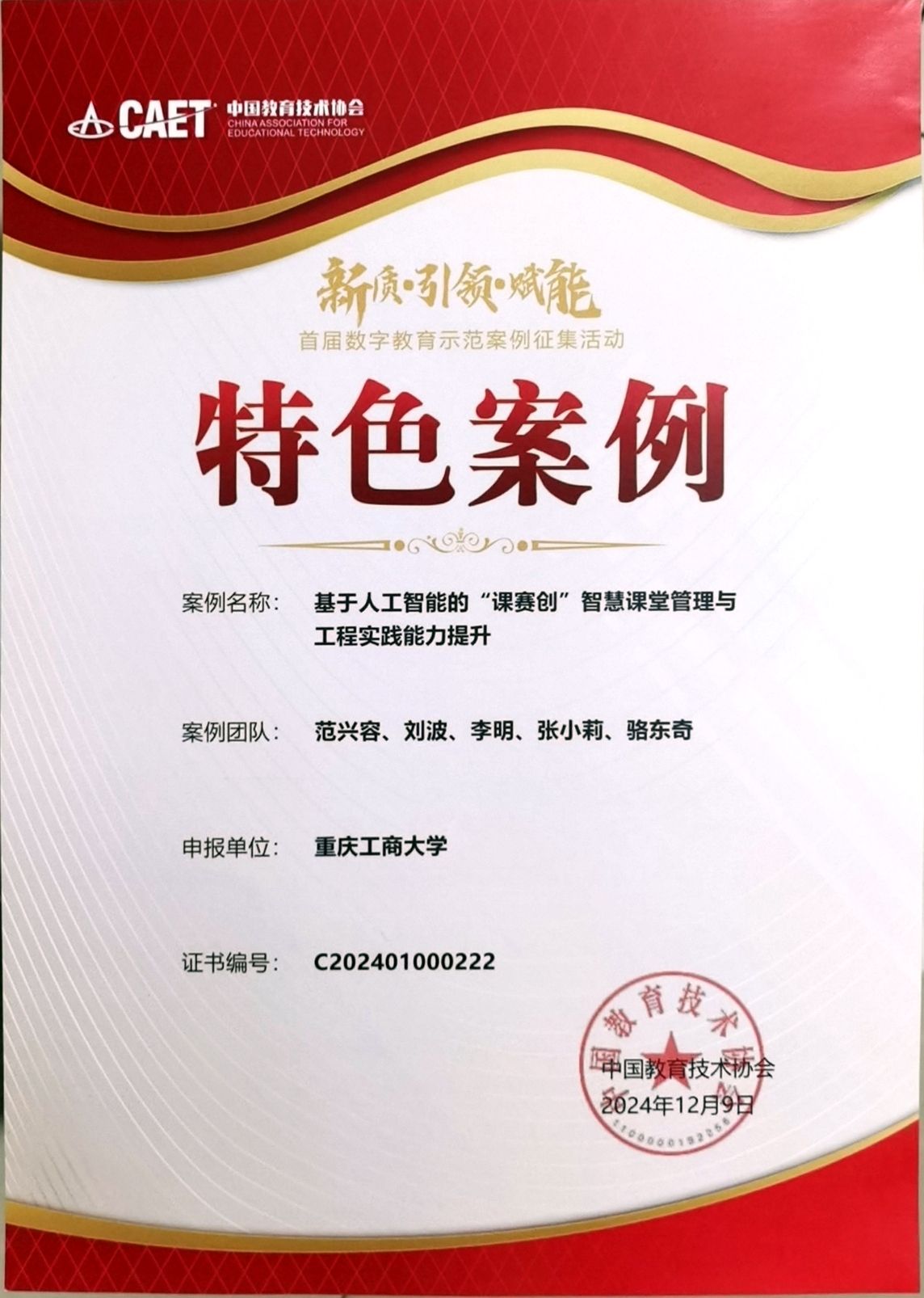 在中国教育技术协会主办的“新质・引领・赋能”首届数字教育示范案例征集活动中,我校申报的《基于人工智能的“课赛创”智慧课堂管理与工程实践能力提升》荣获特色案例。该案例聚焦于利用人工智能技术深度赋能课堂教学、学科竞赛以及创新创业实践,通过构建智能化的课堂管理体系,精准对接学生在第一、二课堂不同学习阶段的需求,有效提升了学生的工程实践能力和创新思维,为培养适应时代发展需求的复合型人才提供了有力支撑。