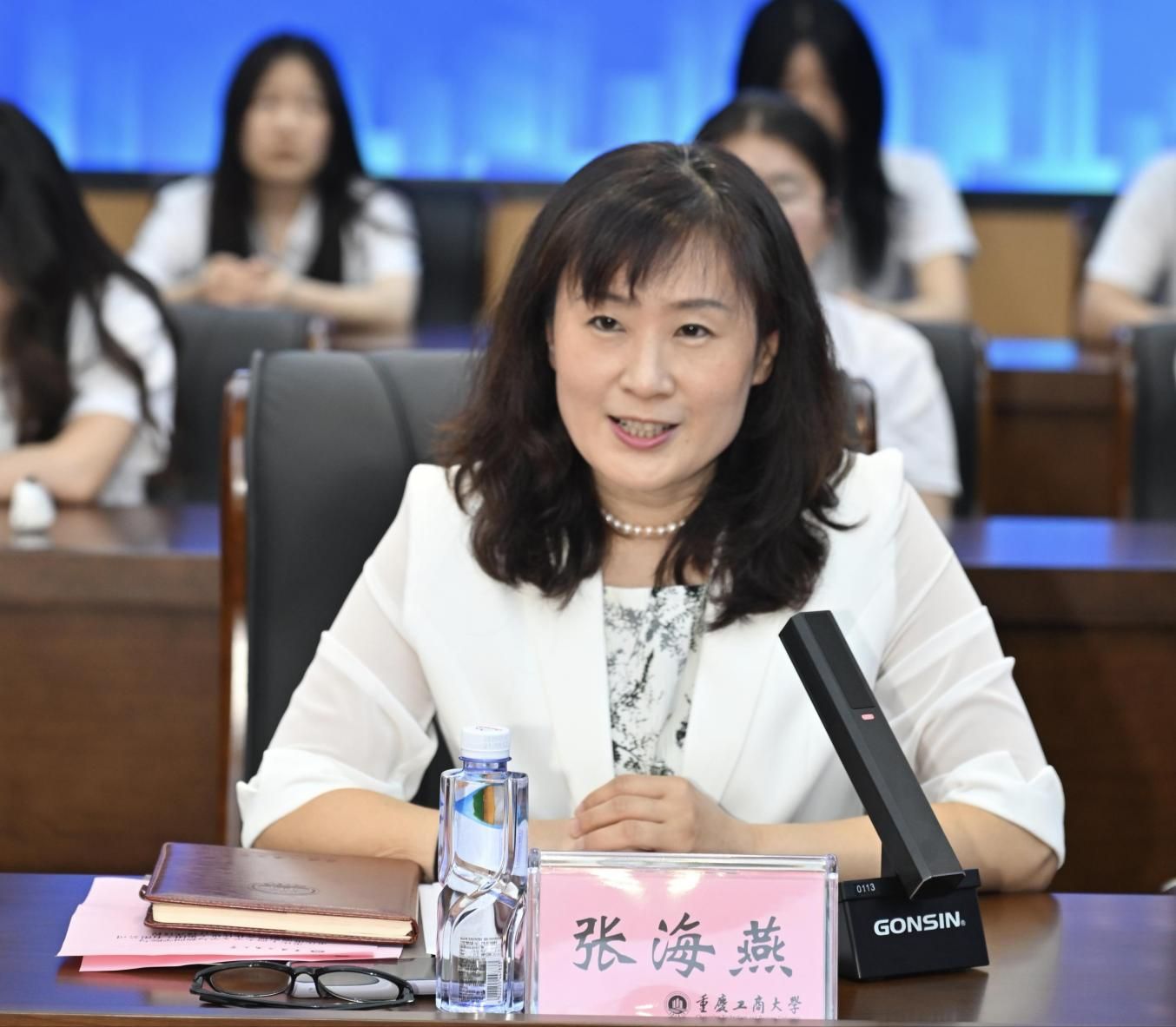 张海燕在致辞中对港渝集团来访表示热烈欢迎,她肯定了学院和集团在人才培养、学科建设和社会服务方面合作取得的前期成果,对集团的捐资助学行为表示高度赞赏,祝愿双方合作顺利,结出累累硕果。