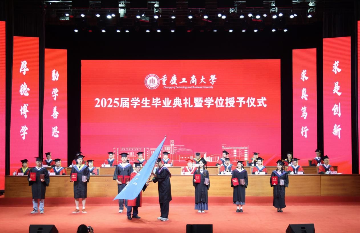 他说,在同学们求学期间,大家共同经历了学校发展历程中一个又一个重要里程碑。学校在激烈的竞争中获批博士学位授予单位,一次性新增3个门类一级学科博士学位授权点,实现了几代重工商大人的夙愿;在国内外主流的大学排名中,学校位次大幅度攀升,应用经济学、工商管理学在软科“中国最好学科排名”中,分别位列重庆市第一、第二位,“环境/生态学”等4个学科进入ESI全球前1%,在最新发布的“2025软科中国大学专业排名”中,我校食品安全与检测专业排名全国第一;理工科的研究成果首次在《Science》刊发,人文社科的研究成果首次入选《国家哲学社会科学成果文库》;学生团队斩获“挑战杯”红色专项、黑科技专项两项全国一等奖;“商工融合”的办学特色日益彰显;茶园校区即将正式启用……这些成绩是全体师生砥砺奋进的结果,也深深镌刻着同学们与母校共同成长的印记。