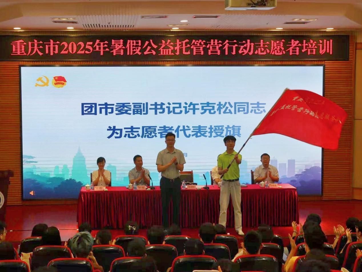 为深入贯彻落实习近平总书记视察重庆重要讲话重要指示精神,贯彻落实市委六届六次全会部署,加快全市域青年发展型城市建设,切实把“假期公益托管营”行动办实办好,6月25日上午,重庆市2025年暑假公益托管营行动志愿者培训在我校南岸校区博智楼7200报告厅开班。共青团重庆市委副书记许克松,党委常委、副校长李国军,重庆市志愿服务指导中心党支部副书记贺伟,校团委书记吴佑波、副书记王微出席培训开班仪式。来自重庆交通大学、重庆理工大学、重庆第二师范学院和我校的300余名志愿者代表集中参训。