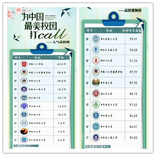 寒冬已去,花已开好,虽在远方,但念校园。3月30日-4月20日,@微博蓝V视频 @微博校园 @微博政务,共同发起了全国高校网络活动——“为中国最美丽校园打call”,北京大学、清华大学、复旦大学、上海交通大学等全国约260所高校共同参与,用图文和视频记录回顾校园最美好的瞬间。在全校师生共同努力下,我校最终荣获人气高校榜全国第4名,高校视频榜全国第10名,话题大赛榜第18名的好成绩。