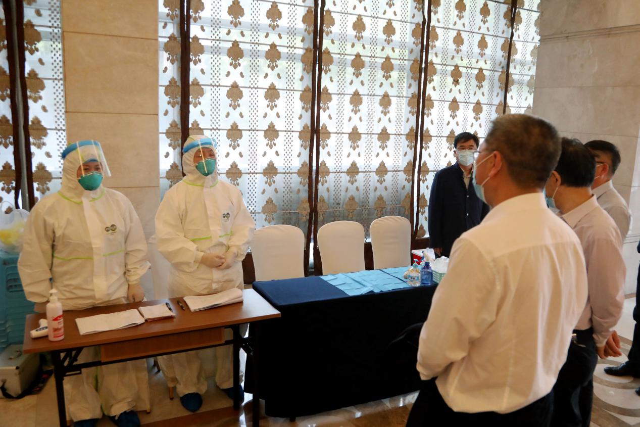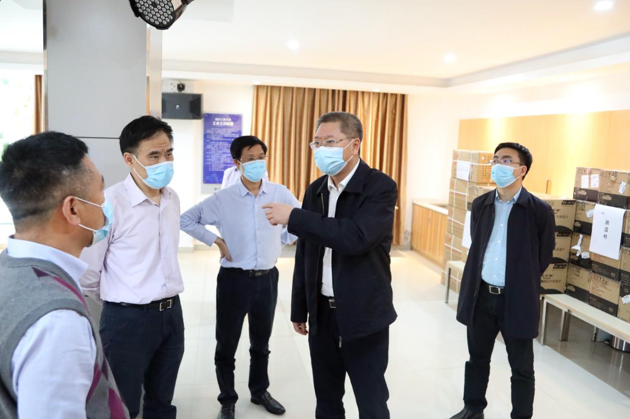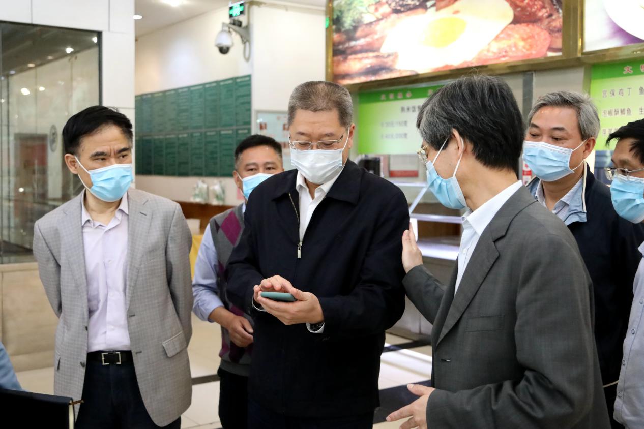 4月29日,市委教育工委书记、市教委主任黄政一行来到九州登录地址_九州(中国)检查疫情防控及开学前准备工作,黄政走进学校食堂,了解食堂取餐用餐、错峰就餐等情况,检查饭菜质量及食品卫生;检查学校开学前防控物资储备和设置隔离点情况,在学校健康观察点向医务人员表示感谢。黄政要求,一定要把疫情防控工作作为当前重中之重的任务,切实保障师生员工的身体健康和生命安全,从严从实从细从快落实好各项防控措施,坚决打赢高校开学复课这场疫情防控阻击战。