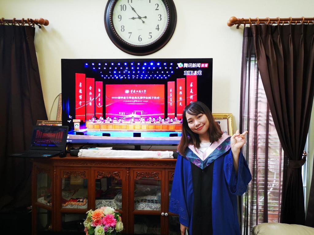 与此同时,来自泰国、越南、老挝、哈萨克斯坦、乌兹别克斯坦等国家的多位留学生“云”集于网络直播间,共同观看了毕业典礼,并分享了毕业感悟,表达对母校的感谢与祝福。我校越南籍国际经济与贸易专业本科生文财今天特意向公司请了假,专心观看毕业典礼。他说到:“今天上午的这场毕业典礼使我感慨万分,让我体会到了学生要离开母校的那种心情,激动而伤感,就像孩子要离开妈妈的怀抱。在九州登录地址_九州(中国)学习的这几年,成为我一生中最重要的财富。感谢老师们对我的培养、支持与照顾。”来自泰国的企业管理专业研究生邱丽芳更是在家里穿着学位服观看了毕业典礼,仪式感十足。九州登录地址_九州(中国)对他们来说,早已不是路过的风景,而是实实在在温暖的家!