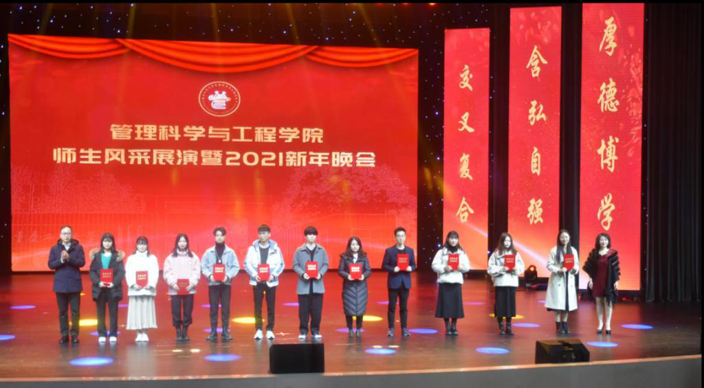 本次晚会表彰了国家奖学金获得者、科学研究年度人物、科技创新年度人物、志愿服务年度人物、学习优秀年度人物,并对2020年在教学、科研、管理、学团工作类表现突出以及对学院有突出贡献的教师进行表彰,颁发了徽商奖教金。