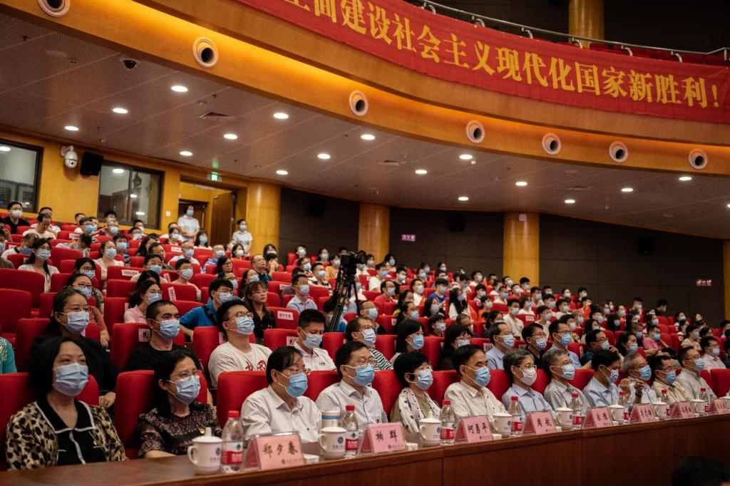我校在三个校(片)区设立集中观看点,组织全校师生观看庆祝大会实况直播。全体在家校领导,校党委常委,全体中层干部、专职组织员,党员代表,民主党派教师代表,教师代表,学生代表,离退休老同志代表在南岸校区剧场、江北校区宏智楼B509学术报告厅和兰花湖片区学术报告厅集中观看。