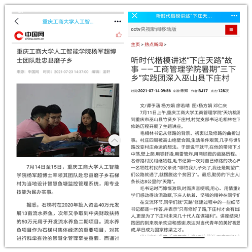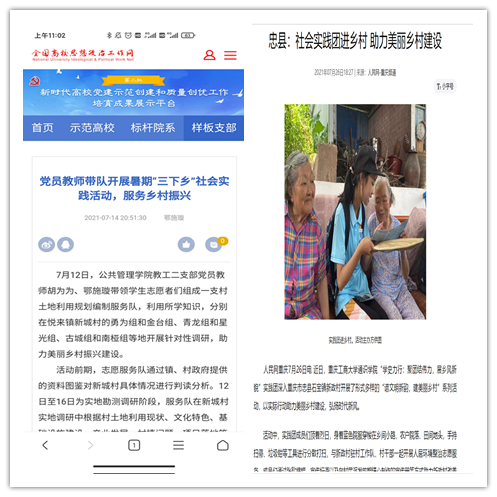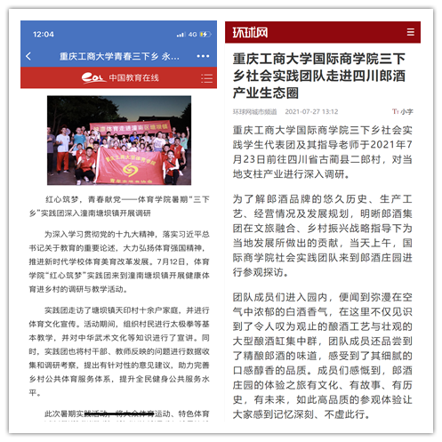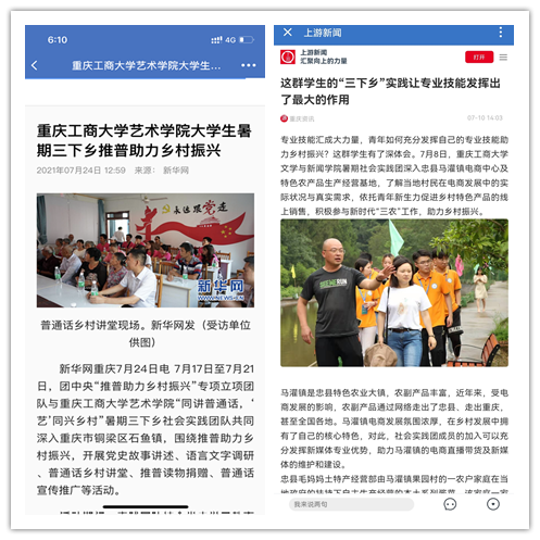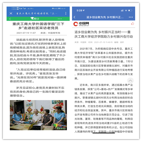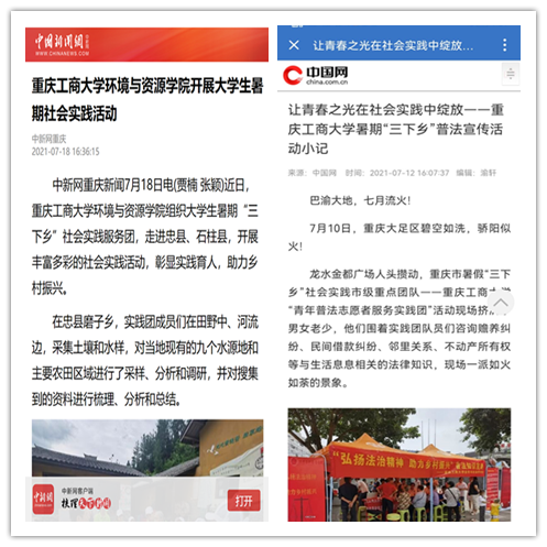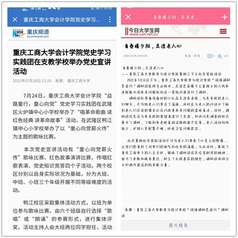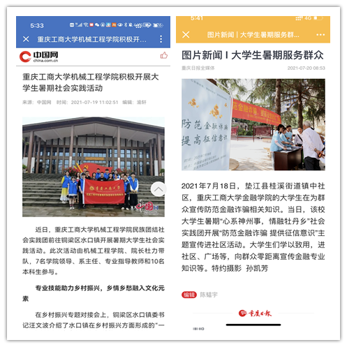 在实践活动期间,各学院创作多种类型的高质量社会实践作品,如《益路童行,童心向党--九州登录地址_九州(中国)会计学院党史学习实践团在支教学校举办党史宣讲活动》《重庆工商学子赴古蔺县 看贫困户"搬"出幸福新生活》《返乡创业敢为先 乡村振兴正当时——九州登录地址_九州(中国)经济学院助力乡村振兴在行动》《脱贫不忘来时路,乡村振兴靠大家——九州登录地址_九州(中国)工商管理学院暑期“三下乡”实践团深入重庆市巫山县下庄村》等,引领广大青年学生在扎根中国大地的生动实践中增强“四个意识”、坚定“四个自信”、做到“两个维护”。实践团深入乡村基层,走访调查,理论宣讲,服务社会,在社会实践的亲身经历中受教育、长才干、做贡献,得到了当地群众及社会的认可,同时实践活动被新华网、人民网、中国青年网、央广网、中国网、中视网、重庆晚报、上游新闻、中国教育在线等多家媒体报道。