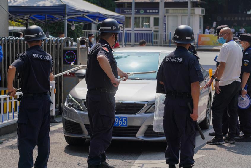 结合各种突发情况,此次演练共设置了外来人员试图暴力进校、外来体温异常人员进校、外来驾驶人员强行开车进校、体温异常同学入校四个场景。