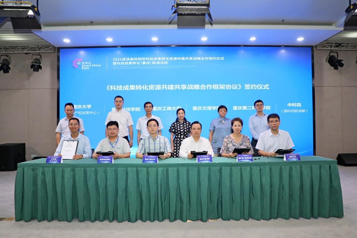 为深入贯彻市委五届十次全会精神和全市高校科技创新大会精神,积极推动成果转化,9月23日下午,由市教委、市科技局、市知识产权局指导,我校与重庆文理学院、重庆科技学院、重庆第二师范学院等单位联合举办的、我校科研处(科技成果转化中心)、重庆金融科技研究院(筹)承办的“2021成渝高校院所科技成果转化资源共建共享战略合作签约仪式暨科技成果转化(重庆)路演”在重庆江北嘴国际投融资路演中心举行。副校长柏群一行出席了活动。