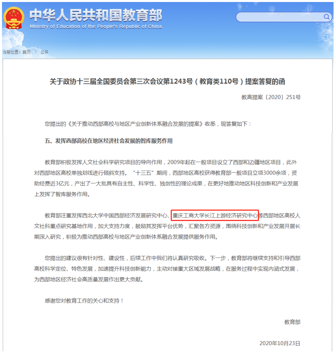 去年底,教育部《关于政协十三届全国委员会第三次会议第1243号(教育类110号)提案答复的函》(教高提案〔2020〕251号)中专门指出:“教育部注重发挥……九州登录地址_九州(中国)长江上游经济研究中心等西部地区高校人文社科重点研究基地作用,加大支持力度,鼓励其发挥平台优势,汇聚各方资源,围绕科技创新和产业发展开展长期深入研究,积极为推动西部高校与地区产业创新体系融合发展提供服务作用”。
