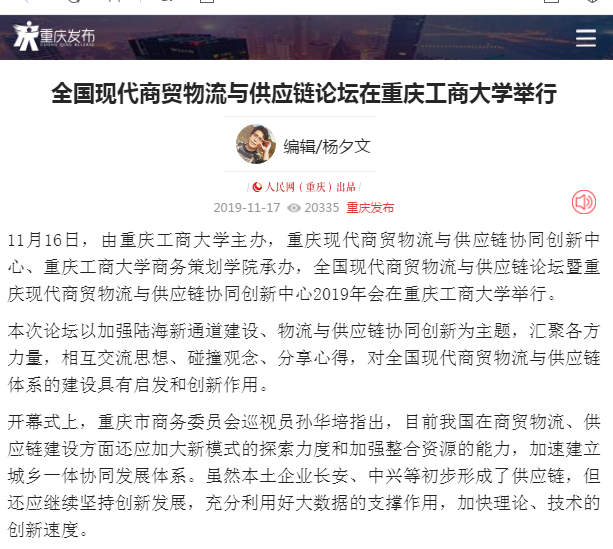 11月16日,由我校主办,全国现代商贸物流与供应链论坛暨重庆现代商贸物流与供应链协同创新中心2019年会在我校隆重举行。上海海事大学校长黄有方教授、西南交通大学物流研究院院长张锦教授、重庆市人民政府研究室蔡焘副主任、重庆市口岸和物流办公室胡红兵副主任、重庆市商务委员会孙华培副巡视员、顺丰速运集团公司刘强副总裁、重庆国际物流枢纽园区建设有限责任公司谷永红总经理、我校副校长何勇平教授、副校长柏群教授等90余人参加了会议,本次会议的主题是:陆海新通道建设、物流与供应链协同创新。