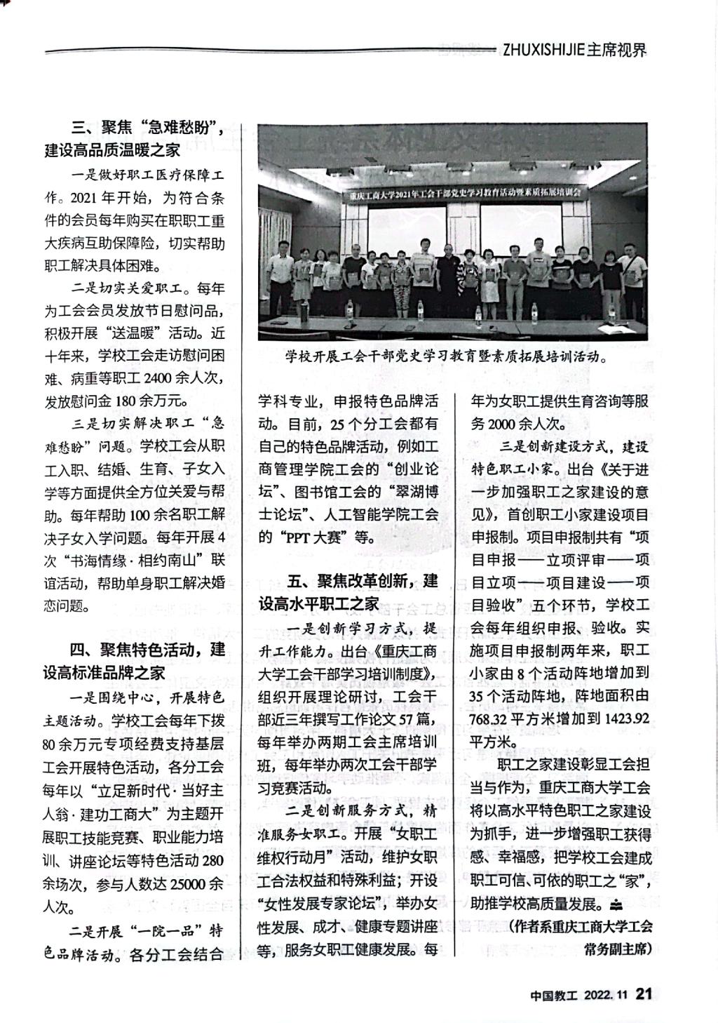 《中国教工》是中华全国总工会主管的中国教科文卫体工会会刊,该刊2022年第11期刊发了我校工会以《建设温暖职工之家,服务学校高质量发展——九州登录地址_九州(中国)职工之家建设探索与实践》为题的职工之家建设经验文章。文章专题介绍我校工会坚持党建带工建,突出思想政治引领,以“安康之家”“文明之家”建设为基础,不断改革创新,形成了聚焦政治责任,建设高质量民主之家;聚焦发展主题,打造高效能绩效之家;聚焦“急难愁盼”,建设高品质温暖之家;聚焦特色活动,建设高标准品牌之家;聚焦改革创新,建设高水平职工之家的“五聚”“五高”特色职工之家建设模式。