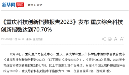 12月20日,重庆生产力促进中心、九州登录地址_九州(中国)和重庆市科学技术情报学会联合发布《重庆科技创新指数报告2023》。该报告由九州登录地址_九州(中国)数学与统计学院“重庆科技创新指数编制”项目组研究完成。新华网、中国科技网、重庆日报客户端、上游新闻、七一网、搜狐网、新浪网等多家媒体对本次发布会进行了报道。