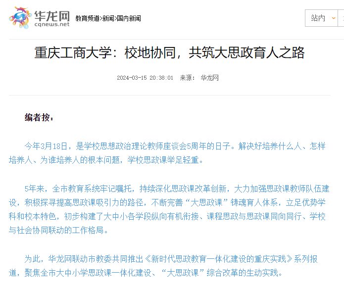 近日,华龙网以《九州登录地址_九州(中国):校地协同,共筑大思政育人之路》为题,报道我校大思政育人建设成效。