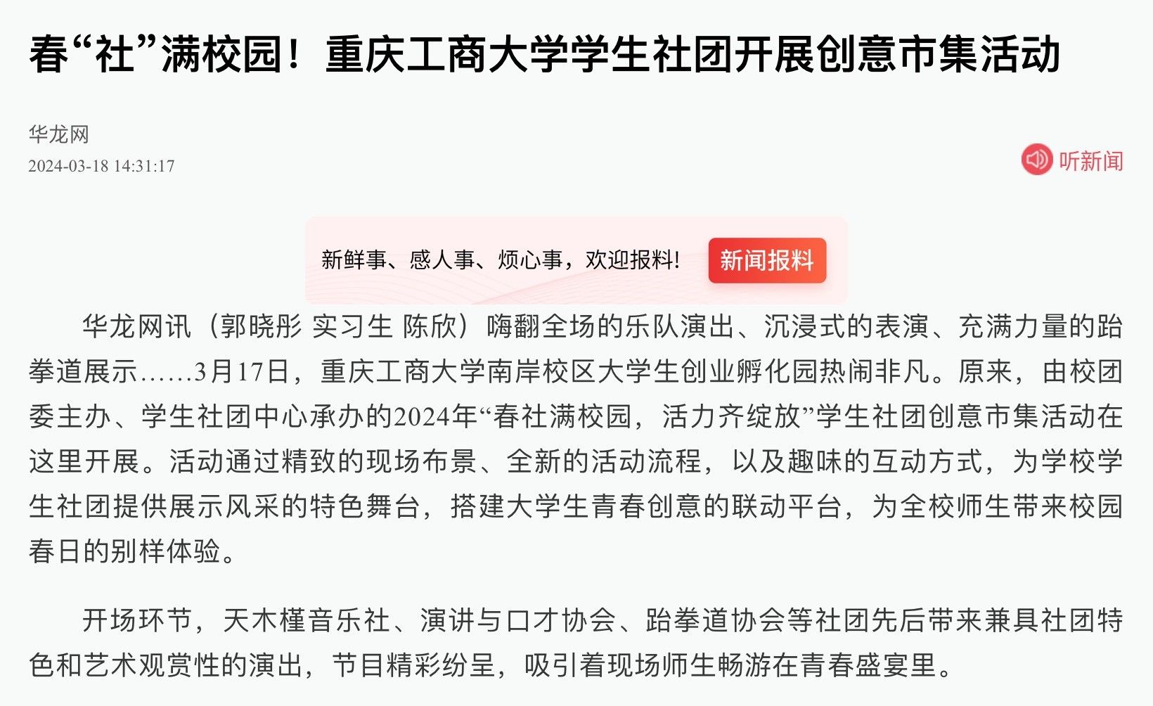 3月17日下午,我校在南岸校区举办2024年“春社满校园,活力齐绽放”学生社团创意市集活动。华龙网对活动进行了报道。