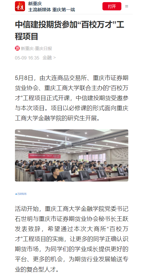 金融学院为深化研究生教育教学改革,在研究生院的大力支持下,从2017年开始,持续与大连商品交易所、重庆市证券期货业协会、联合开展“百校万才”工程项目,以项目制方式与金融专硕课程有机衔接,将理论与实践相结合,积极培养应用型复合型金融人才。5月8日,2024年大商所“百校万才”工程项目班开班仪式在研究生院明智楼110405举行。重庆日报、华龙网对此进行了报道。