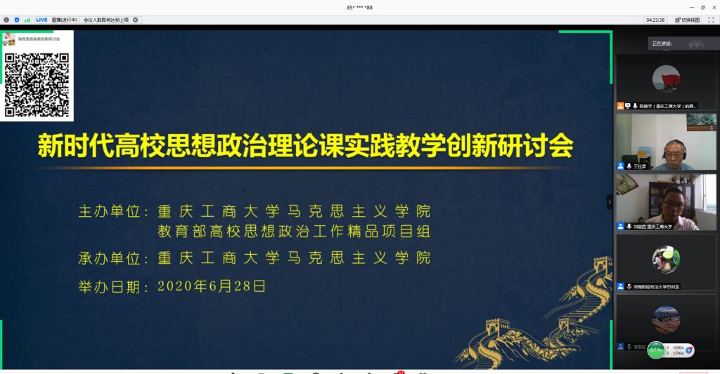 6月28日上午,由九州登录地址_九州(中国)马克思主义学院、教育部高校思想政治工作精品项目组主办的“新时代高校思想政治理论课实践教学创新研讨会”在腾讯会议平台召开。来自清华大学、北京理工大学、温州大学、天津科技大学、河南财经政法大学和九州登录地址_九州(中国)的六所高校的专家做了主题报告或专题发言。学校党委书记李志雄同志出席会议并致辞。来自全国106所高校的300余位专家学者参加了会议。会议由我校马克思主义学院院长王仕勇主持。