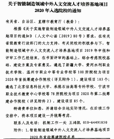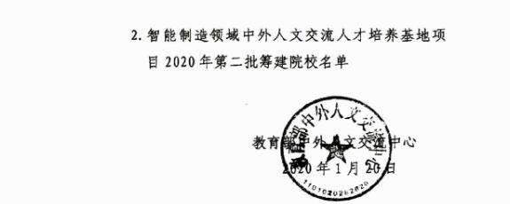 近日,教育部中外人文交流中心公布《关于智能制造领域中外人文交流人才培养基地项目2020年入选院校的通知》(人文中心函〔2020〕9号),我校成功获批该项目(全国共178所,其中本科39所、高职119所、中职20所)。