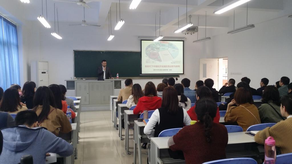 2018年3月26日下午2点,清华大学五道口金融学院张伟博士在田家炳教学楼50306教室,以新时代下中国经济金融形势分析与研判为题,为我校财金学子作了一场内容丰富的前沿讲座。学院财税系副主任朱沙、金融工程系主任张理平等老师和同学们一同聆听了讲座。讲座由财政金融学院副院长曾胜教授主持。
