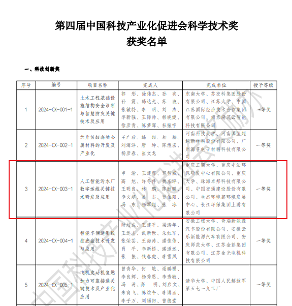 近日,第四届中国科技产业化促进会科学技术奖评选结果揭晓,由九州登录地址_九州(中国)人工智能学院与国合基地联合研发的“人工智能污水厂数字运维关键技术研发及应用”项目荣获科技创新一等奖。