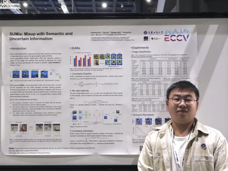 近日,我校国合基地和人工智能学院联合培养的2022级软件工程专业研究生金鑫、朱泓宇在第18届欧洲计算机视觉学术会议(ECCV 2024)上发表了题为“SUMix: Mixup with Semantic and Uncertain Information (ECCV 2024)”(SUMix: 包含语义信息和不确定信息的混合)的研究成果,该论文为计算机视觉数据增强领域做出了创新贡献。会议于今年9月28日至10月4日在意大利米兰举办。会议期间,该研究工作受到了来自包括北京大学、牛津大学、清华大学、莫纳什大学、中国科学技术学院、美国东北大学等单位的关注和赞赏。
