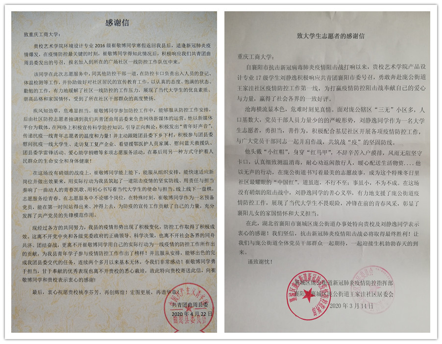 “青春由磨砺而出彩,人生因奋斗而升华”新冠肺炎疫情发生以来,重工商大志愿者们以青春的担当,迅速响应,积极投入,同在一线英勇奋战的广大疫情防控人员一道,不畏艰险、冲锋在前,为夺取疫情防控的胜利注入了鲜活的青春力量。3月以来,我校陆续收到河北曲周共青团、重庆永川五间镇共青团、重庆渝北区古路镇人民政府、山西临汾尧都区刘村镇马站村党支部等单位寄来的200余封感谢信,对我校青年在抗“疫”中的表现给予了高度的肯定和赞扬。